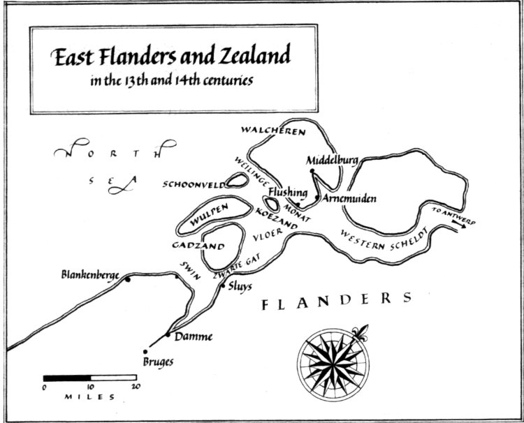 On 23rd June 1340 Edward III and his fleet sighted the French fleet in the Swin off Sluys, Flanders. It would appear that rather attack directly from the North Sea the next day the English approached from the north east from the Western Scheldt through a channel behind the island of Cadzand. There they met a more powerful French fleet anchored and roped together to face an attack from the West. In the wrong orientation and unable to manoeuvre the French were wiped out in detail, loosing 190 ships (out of 202) and 16-18000 men.